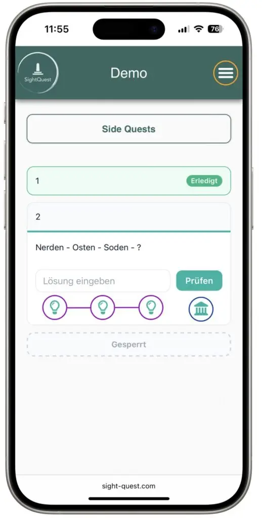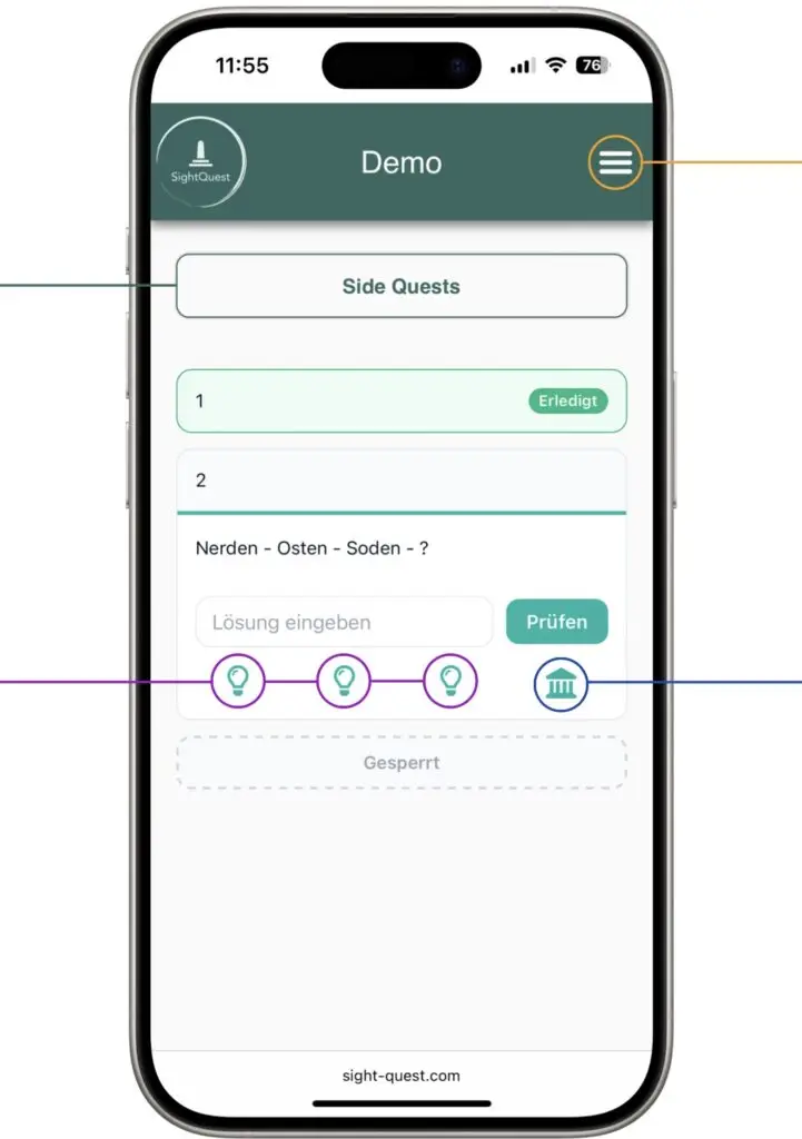 Hier hast du die Möglichkeit auf die SightQuest-Startseite zurückzukehren oder die Sprache zu wechseln