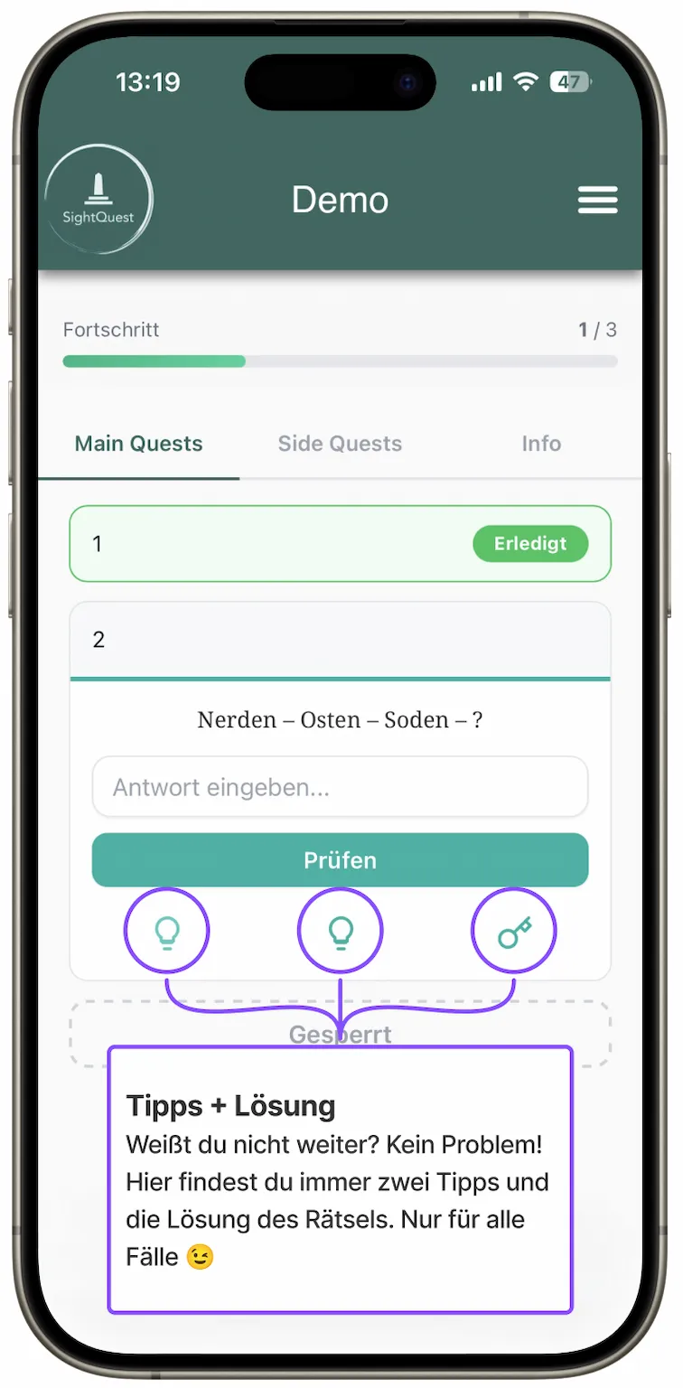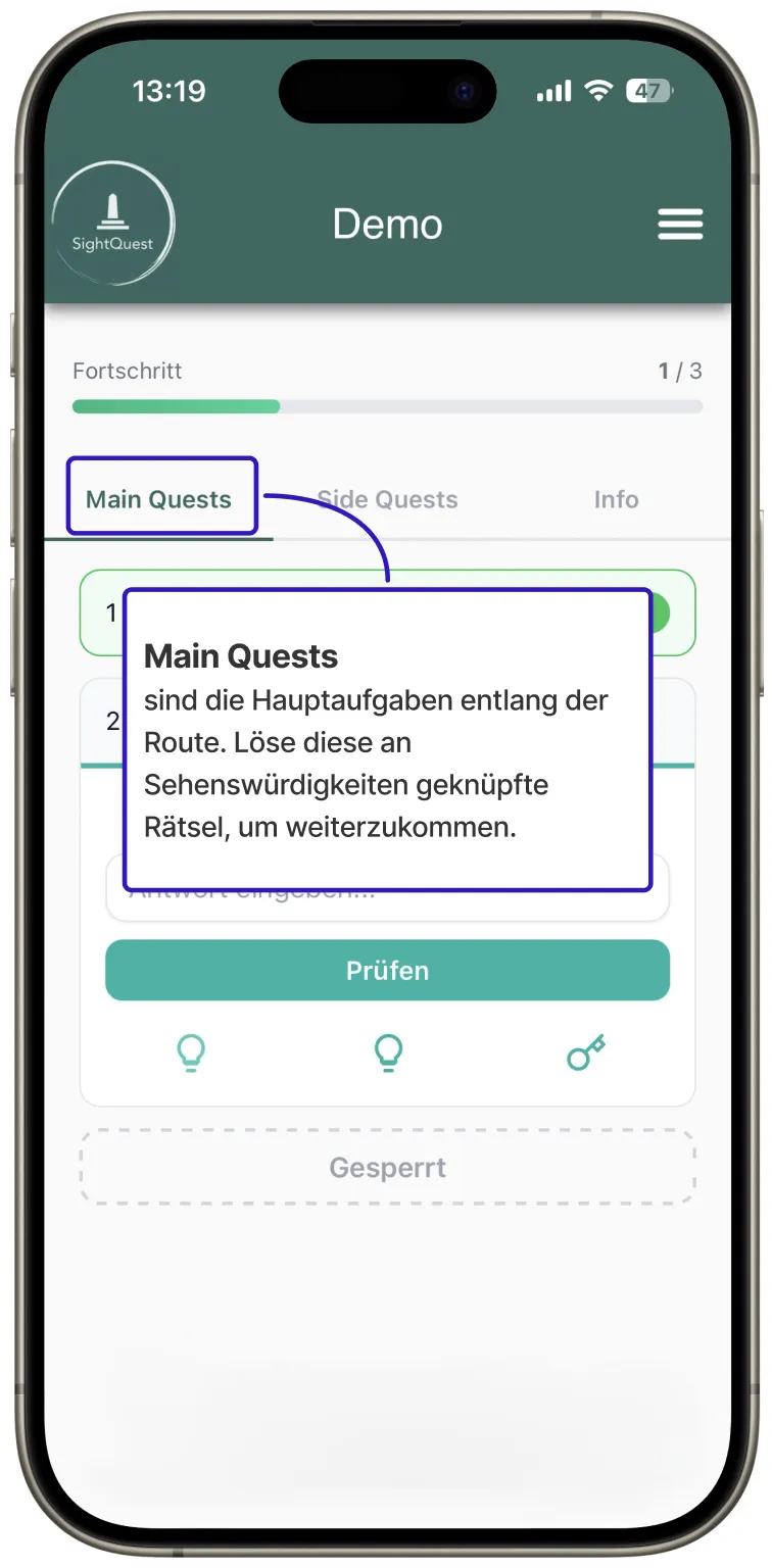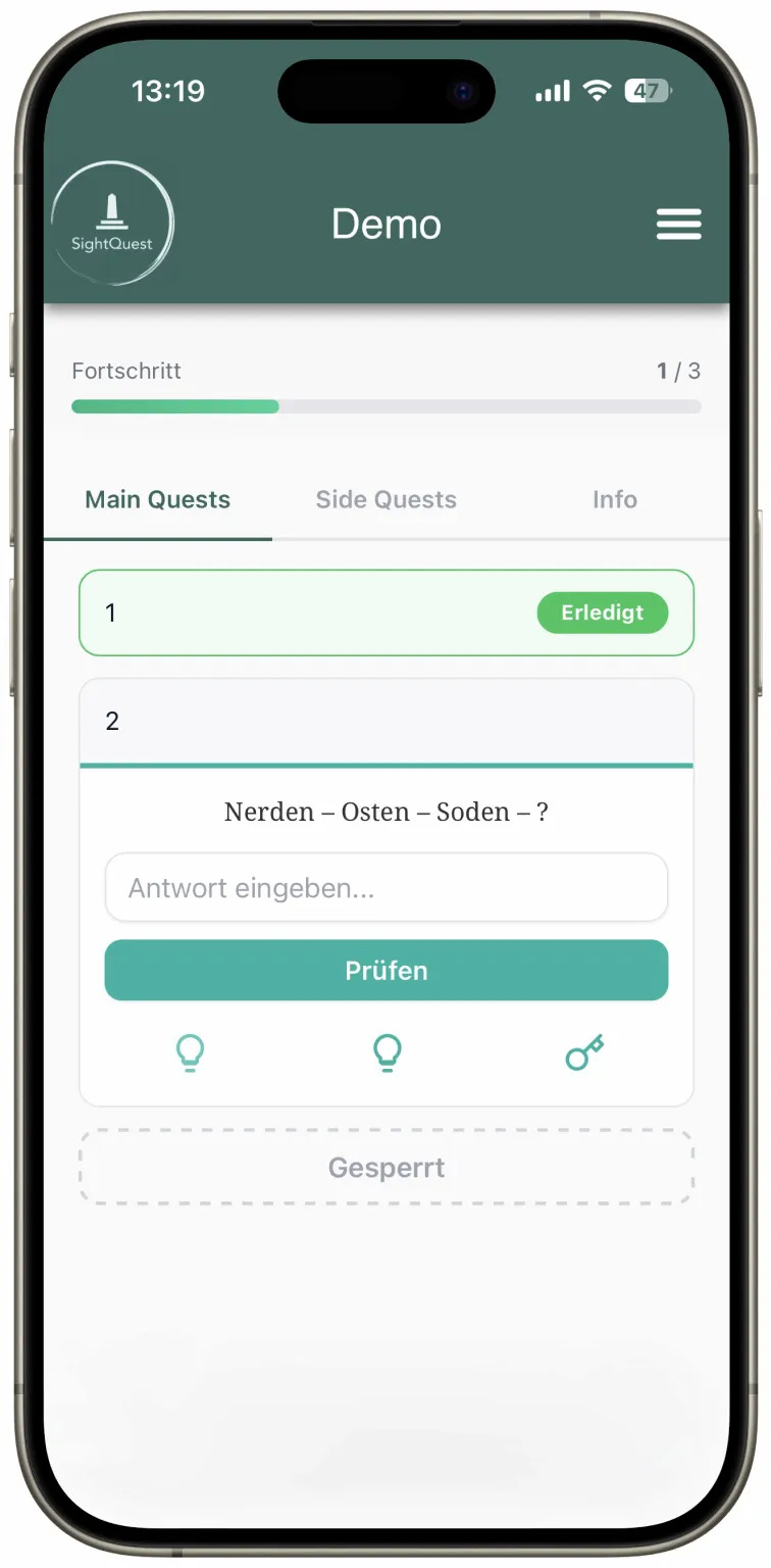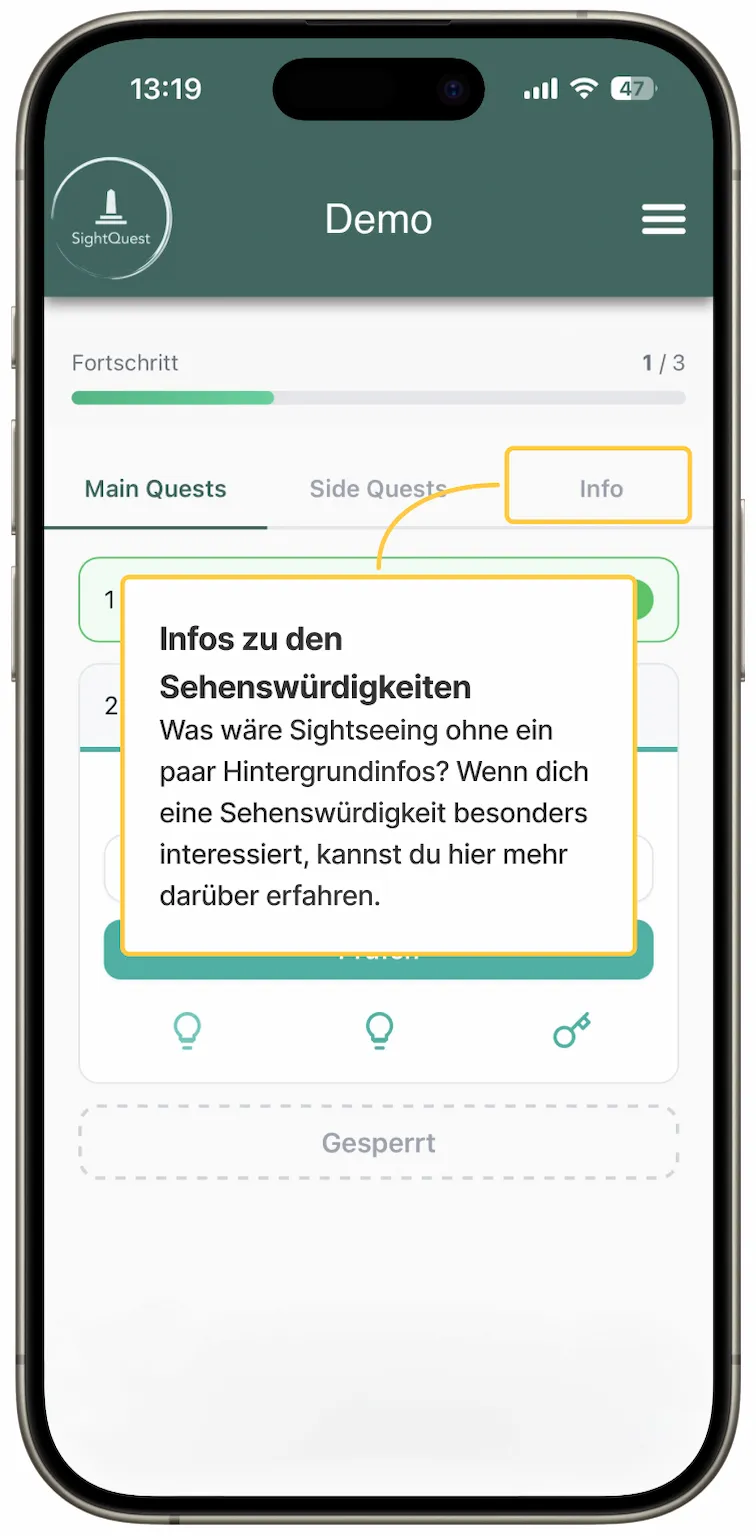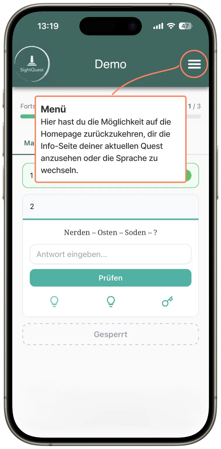 Hier kommst du zu unserer Demo Quest. Schau dich gerne um und probiere ein wenig, damit du anschließend bei der echten Sight Quest direkt loslegen kannst!